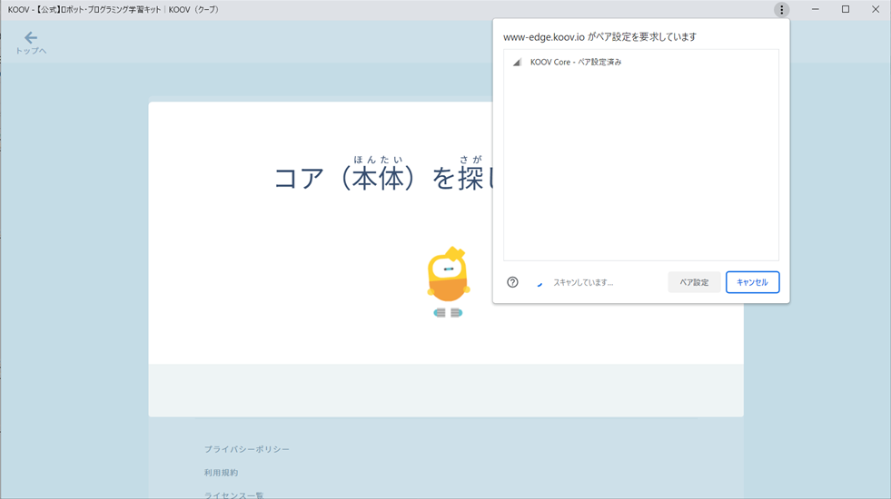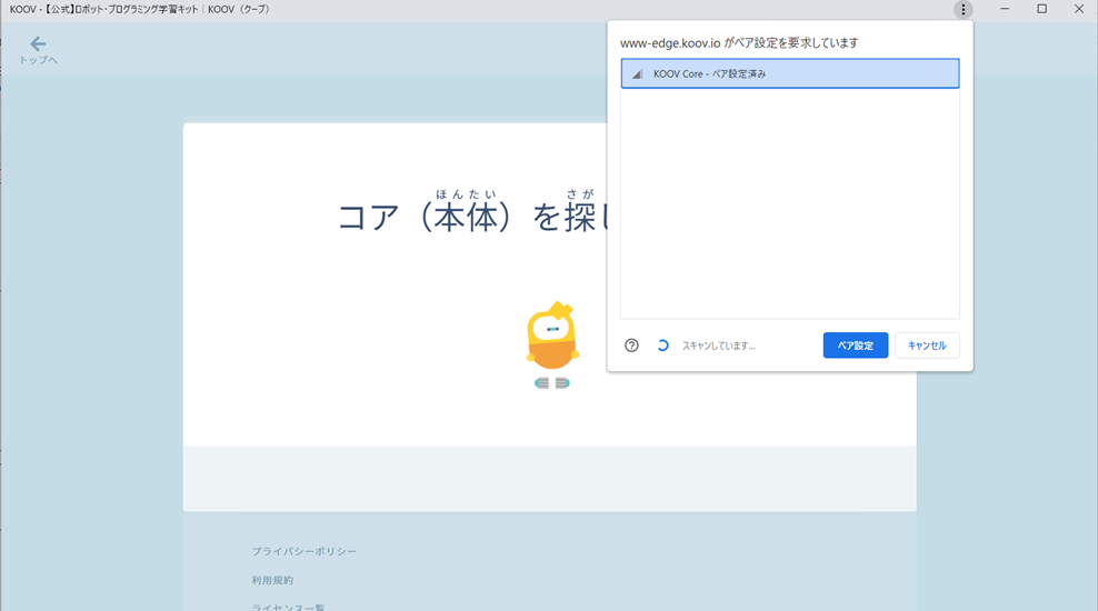 「KOOVCORE(お使いのコア名)-ペア設定済み」を選択して「ペア設定」ボタンを押して操作を進めてください。