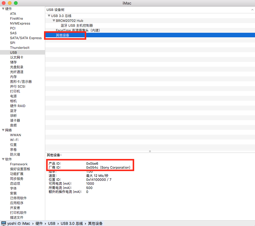 点击"USB",然后选择“其他设备”。其中如有厂商ID是“Sony Corporation”的即表示被正确识别。